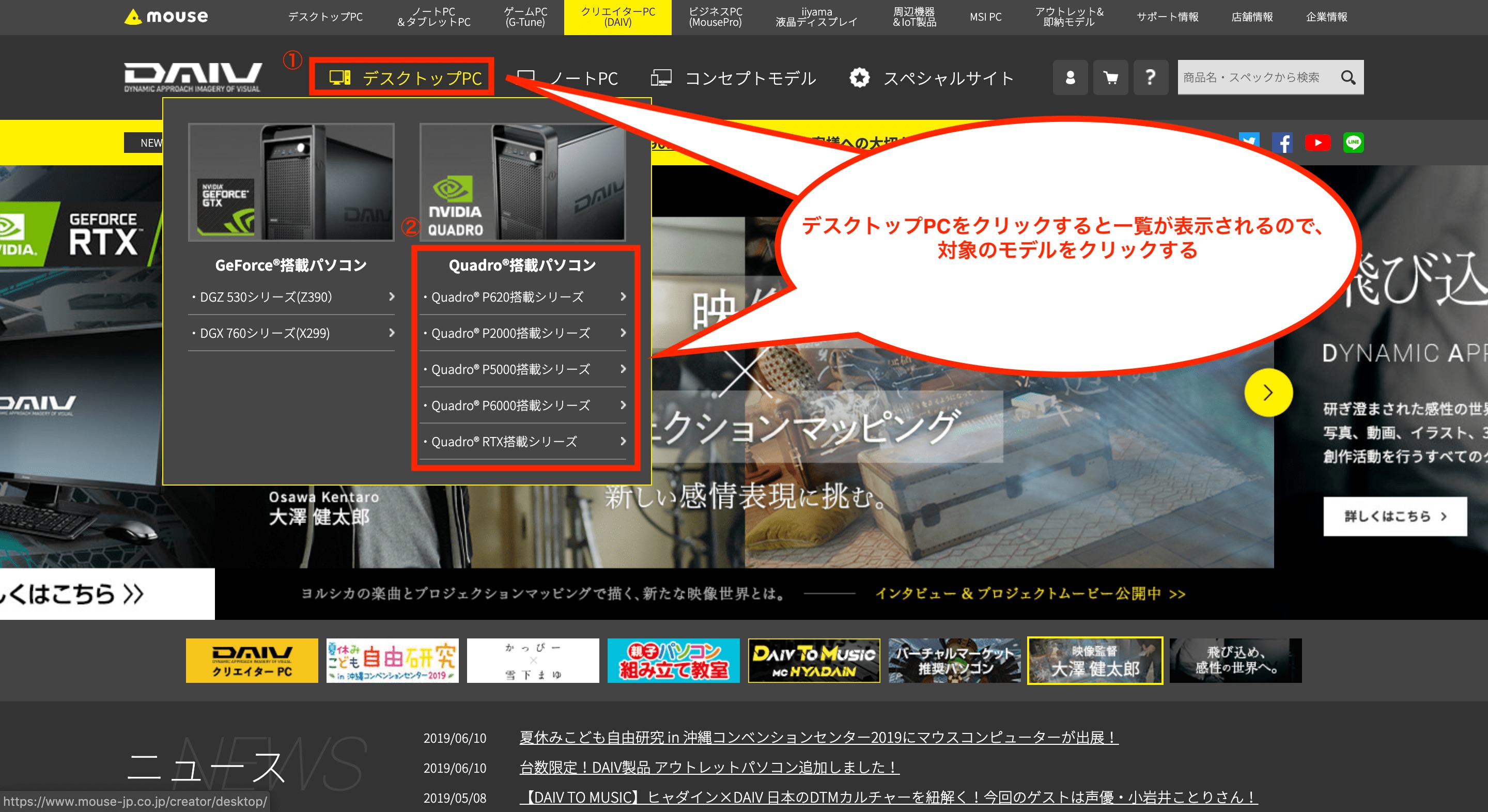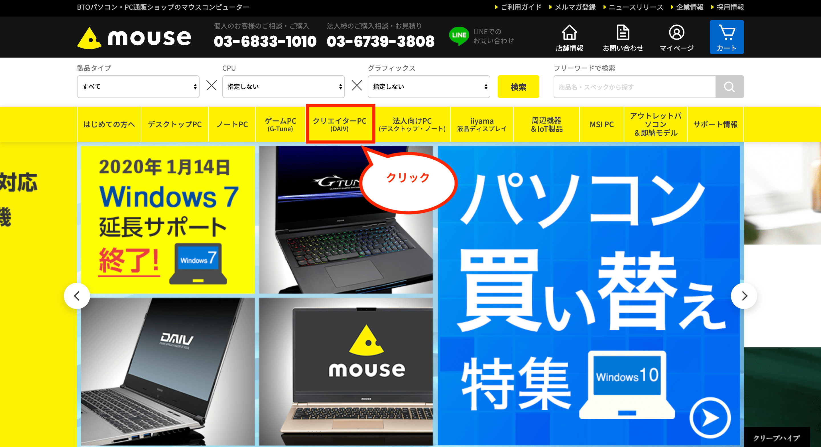 そんなマウスコンピューターのクリエイター向けPCを公式サイトで確認するには、画面上のメニュー「クリエイターPC(DAIV)」をクリックします。
