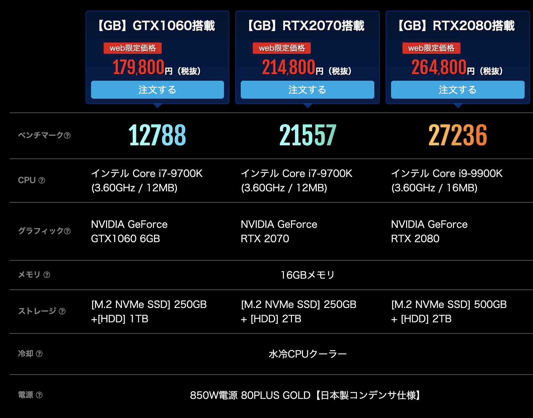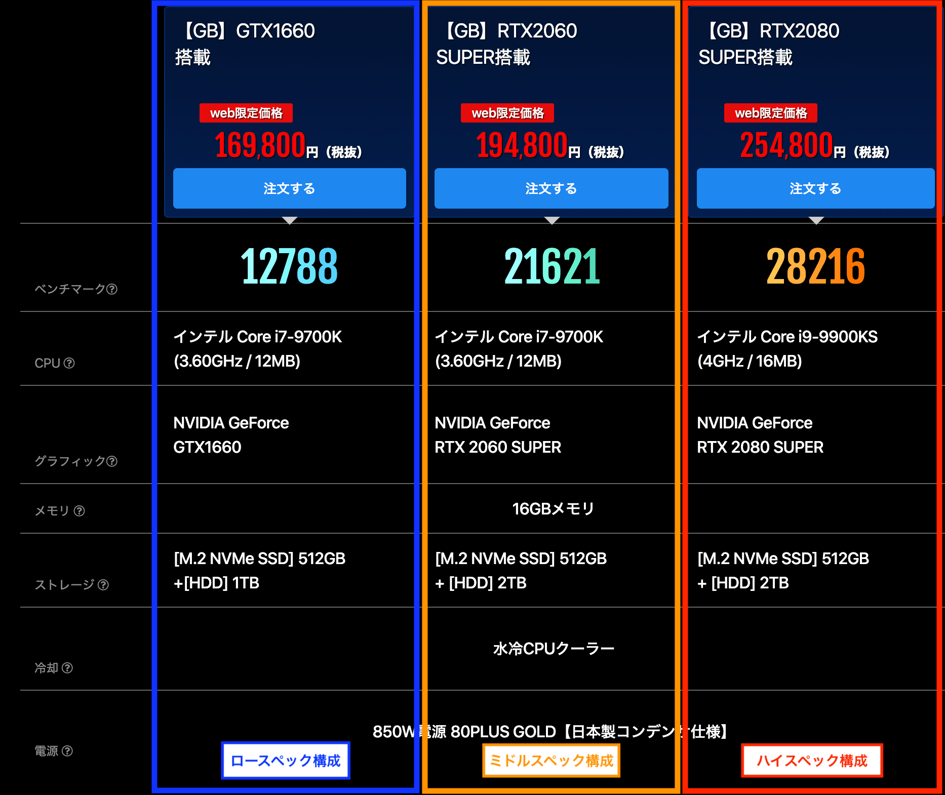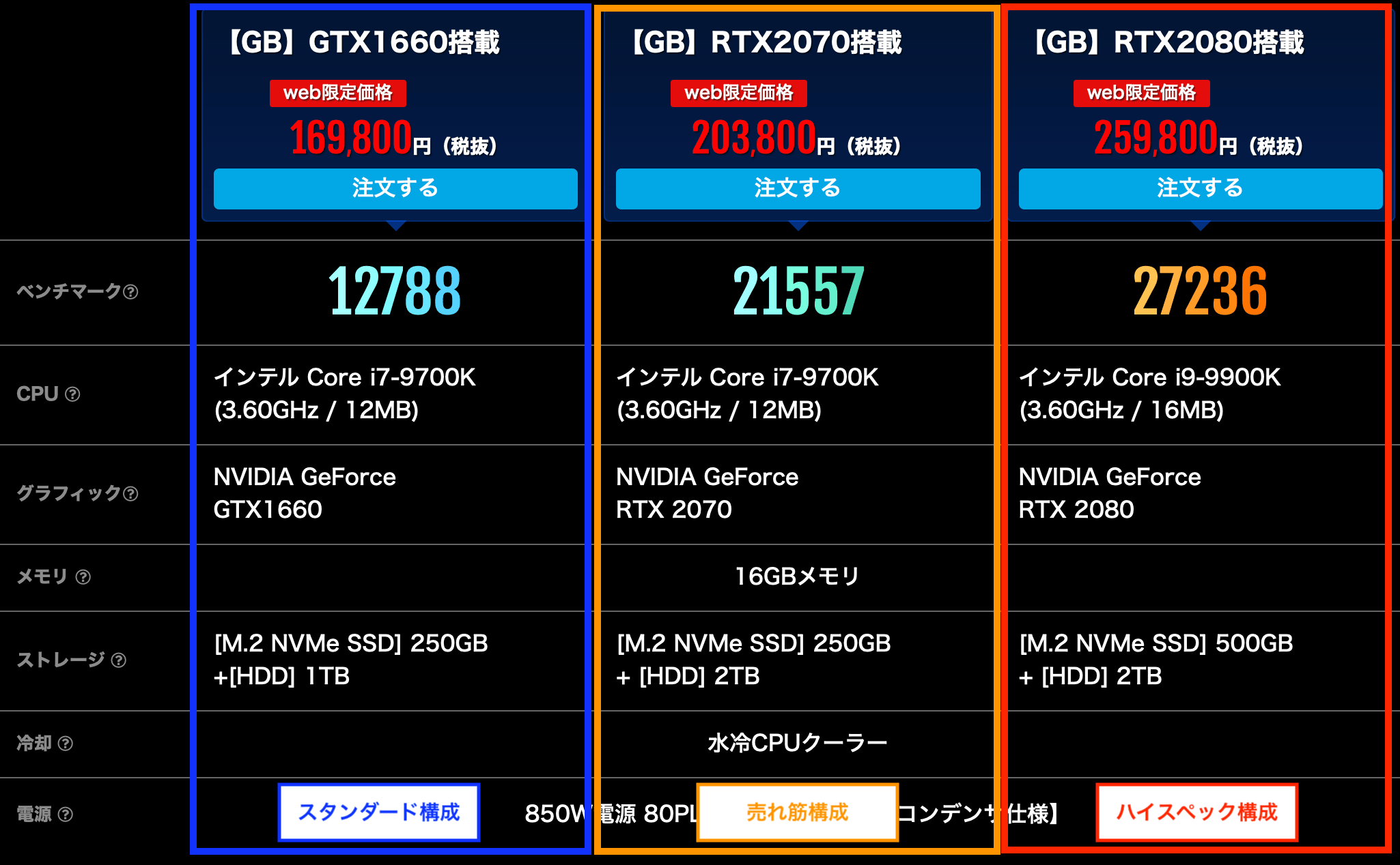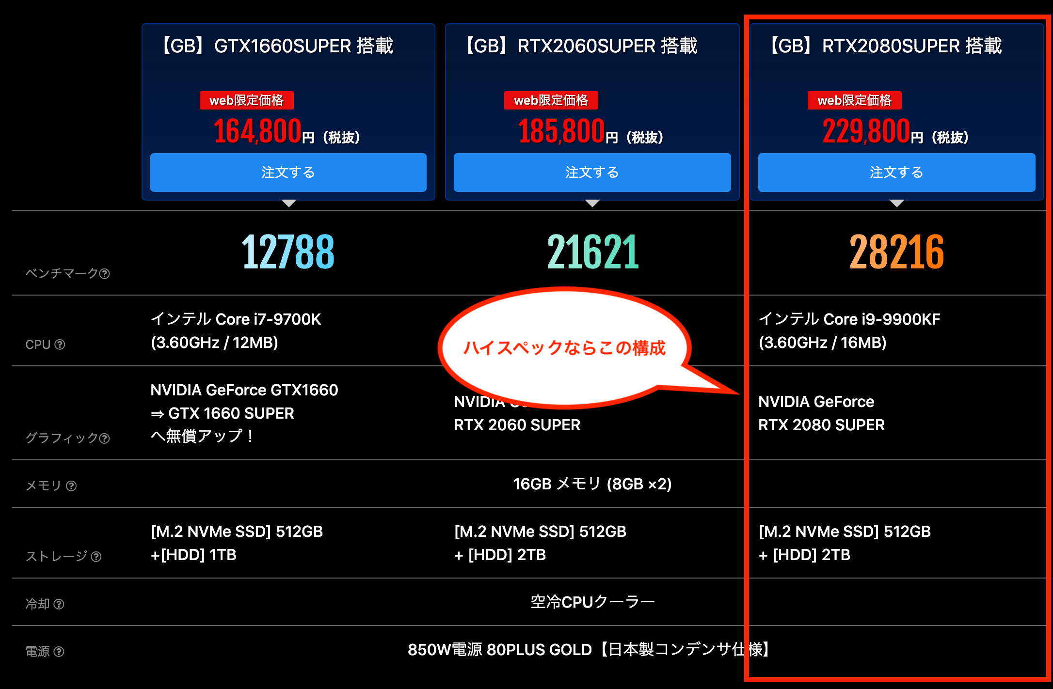 「GBシリーズ」は初期構成が3タイプありますが、ハイスペック構成なら一番右のモデルを選びましょう。