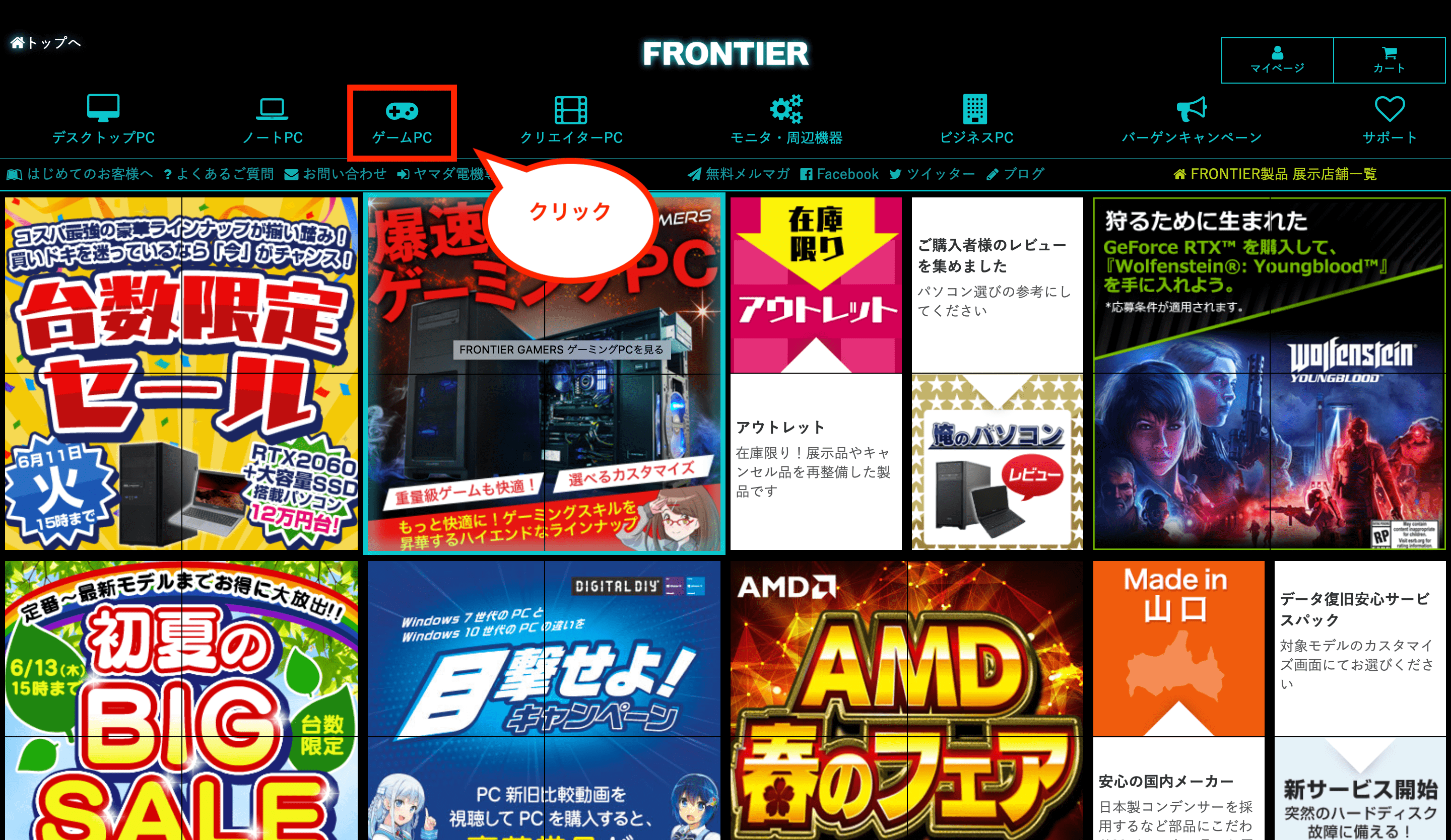 そんなフロンティア(FRONTIER)の「SLI構成モデル」を公式サイトで確認するには、画面上のメニュー「セール・特集」をクリックします。