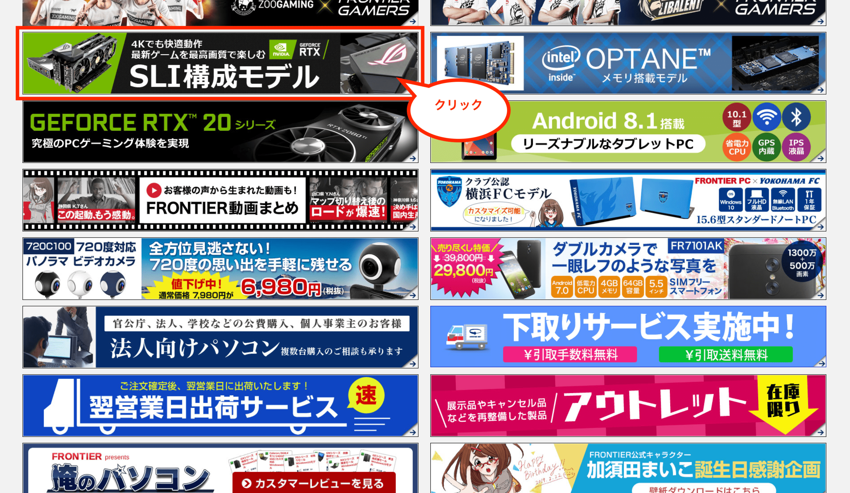 セール・特集のページが表示されるので、画面下にあるバナー「SLI構成モデル」をクリックします。