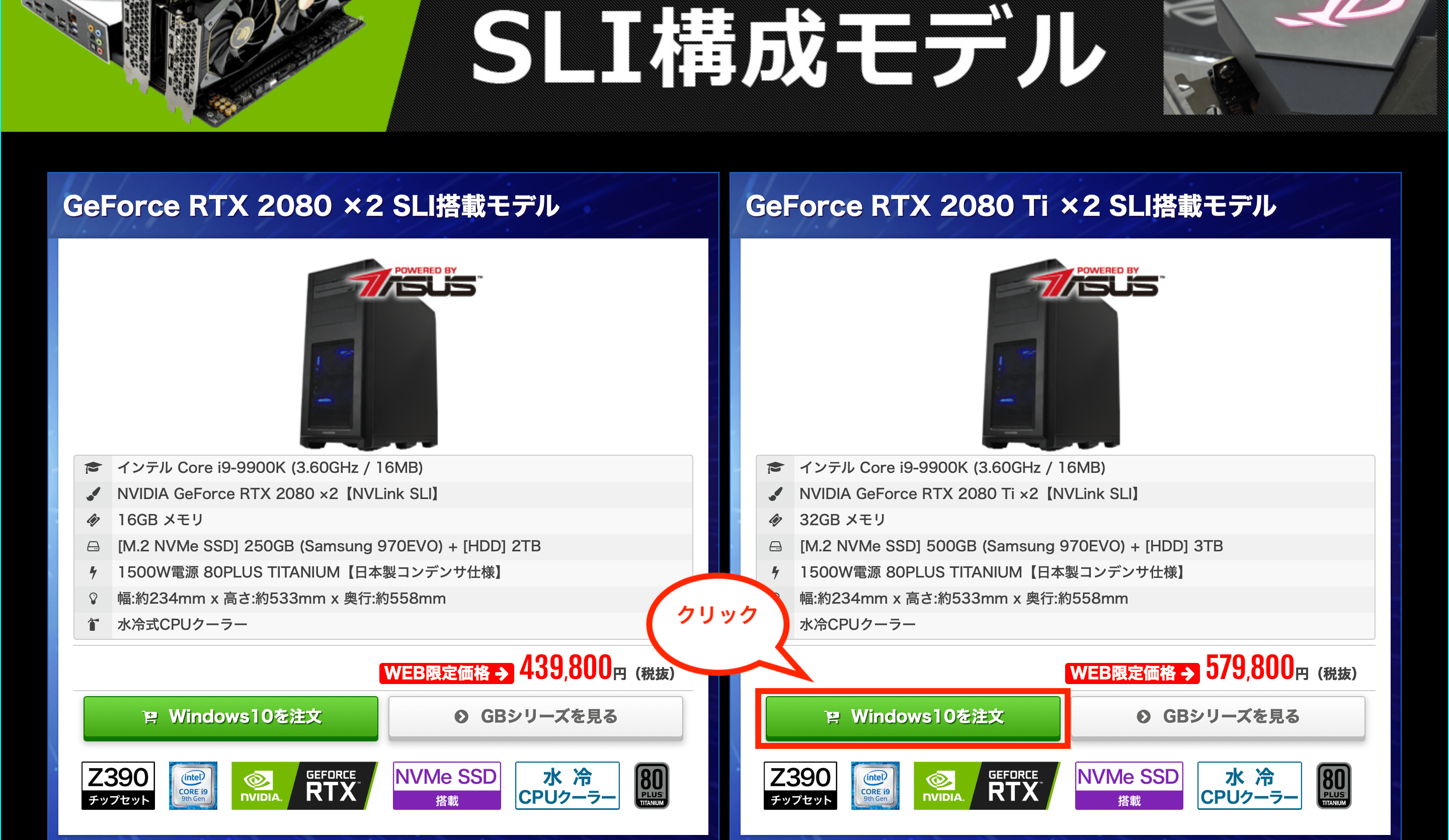 SLI構成モデルが表示されるので、対象の製品の「Windows 10を注文」をクリックし、詳細を確認できます。