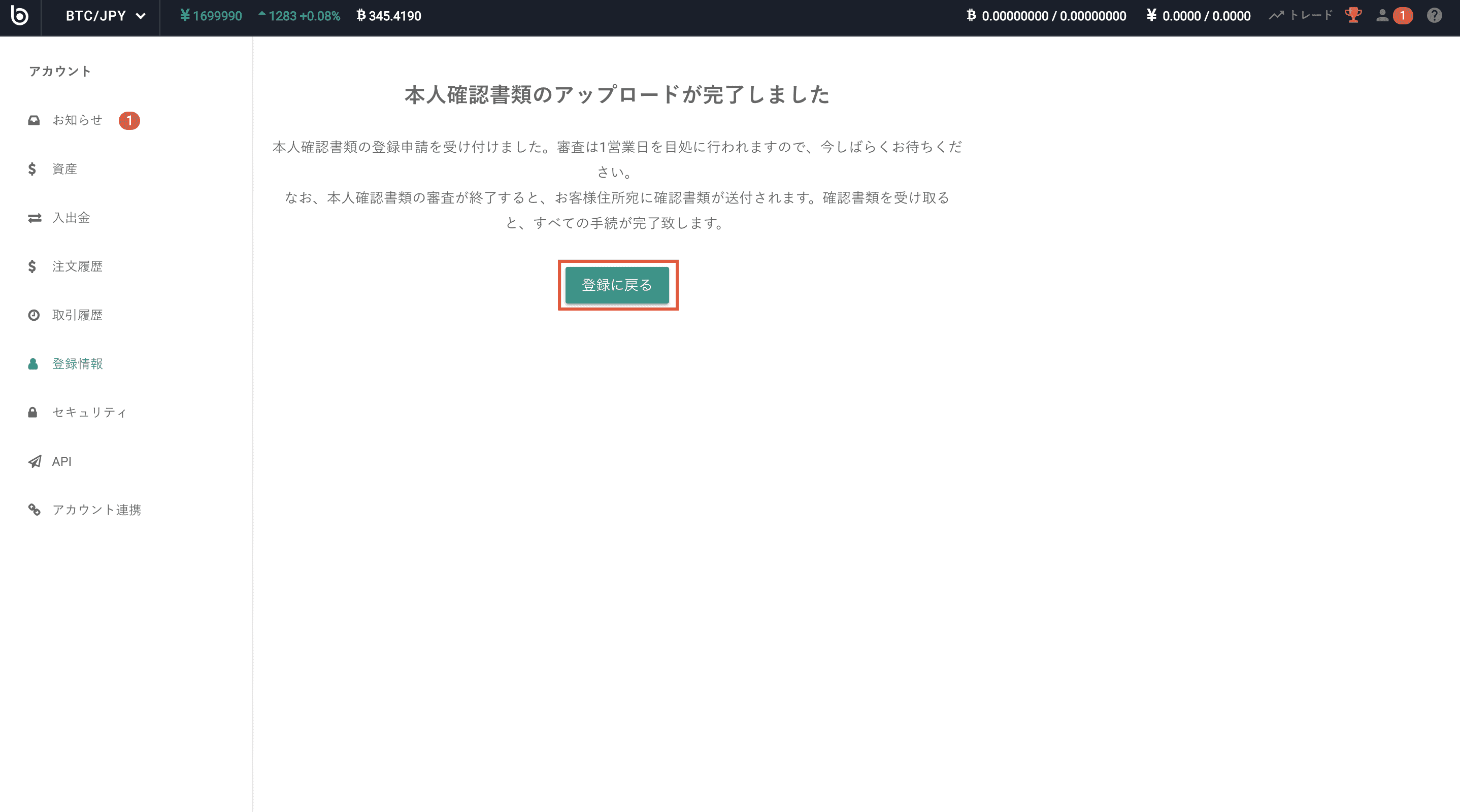登録内容を確認し、「戻る」をクリックします。