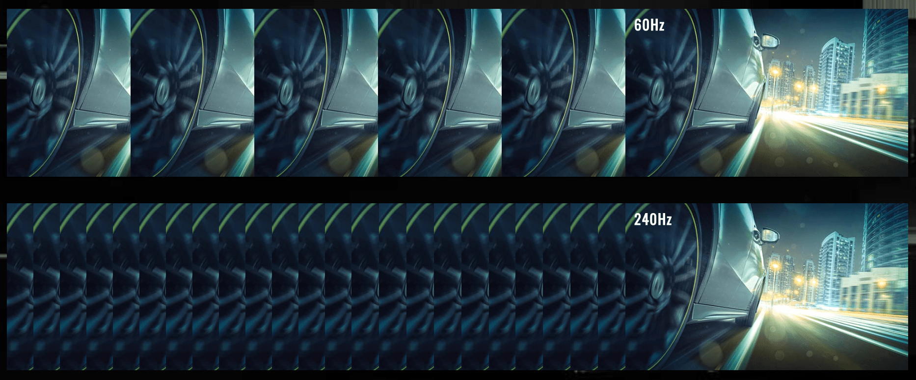 リフレッシュレートが240Hzなら、60Hzに比べて4倍高速に映像を表示し、なめらかで美しい映像を表示可能です。