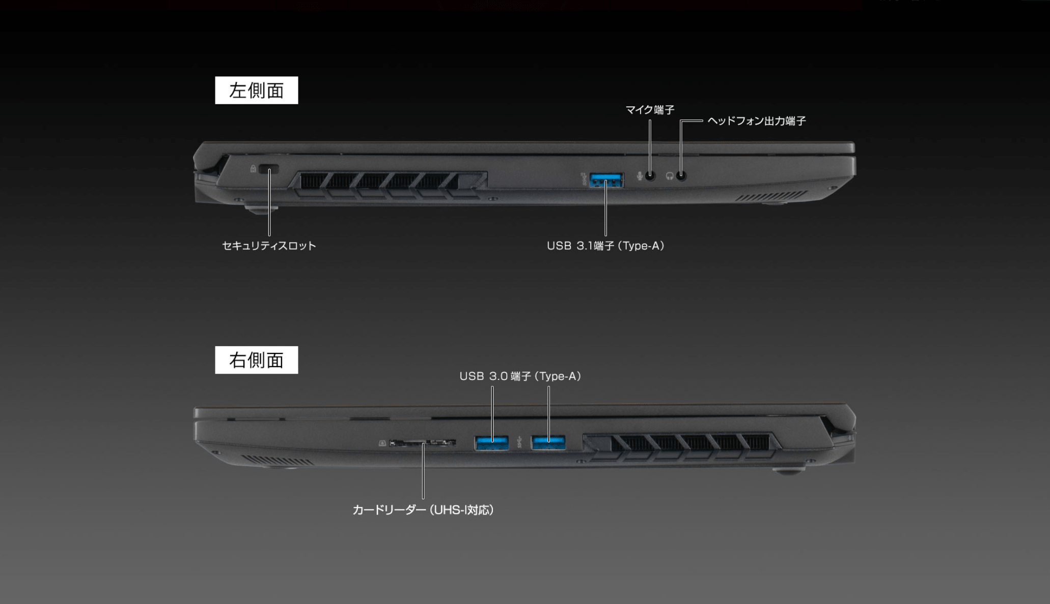 Webカメラやマイクのほか、側面にはカードリーダーも搭載し、付いていると便利なインターフェースは標準搭載しています。