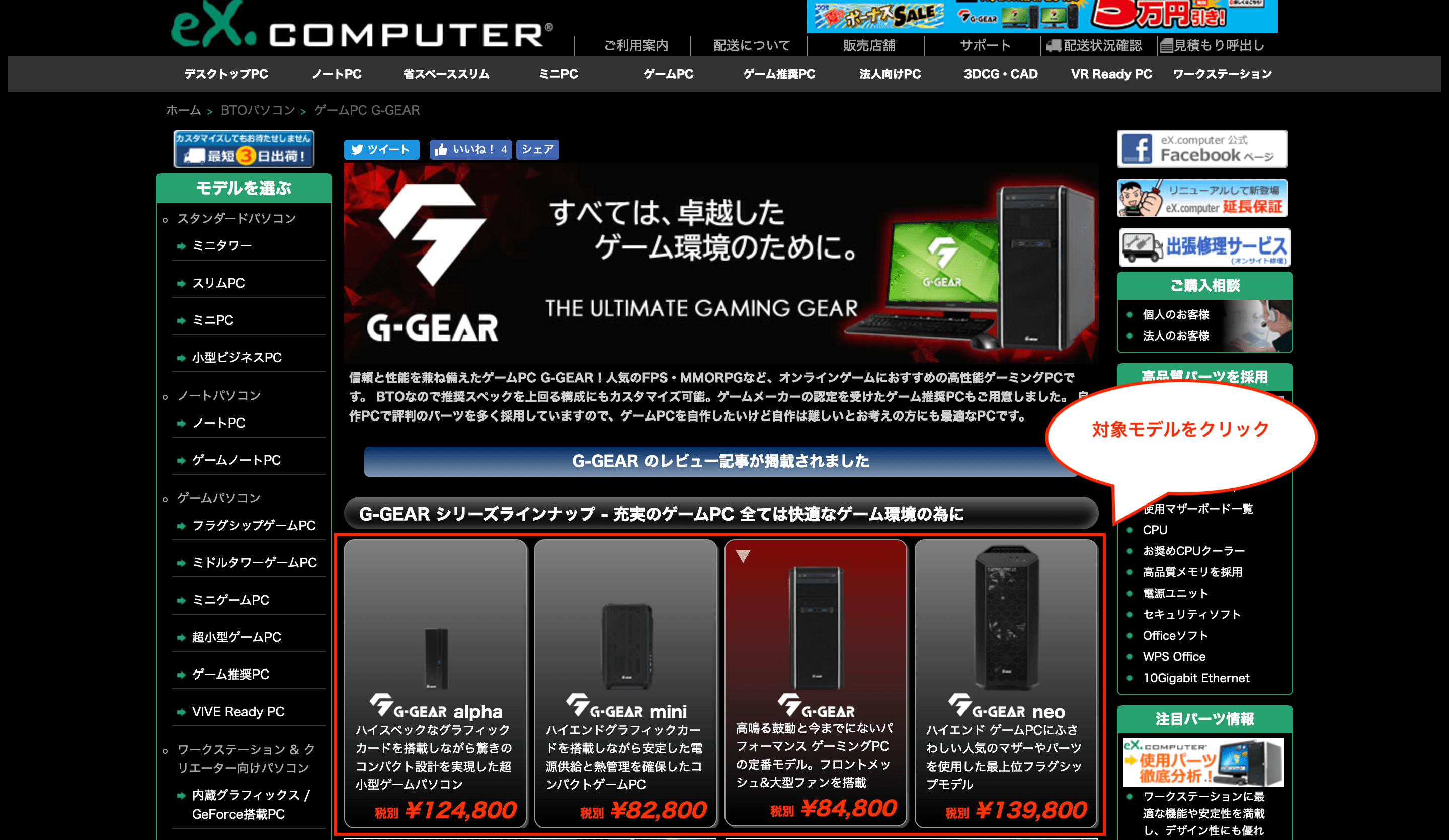 G-GEARのラインナップページが表示さらるので、画面下の対象モデルをクリックします。