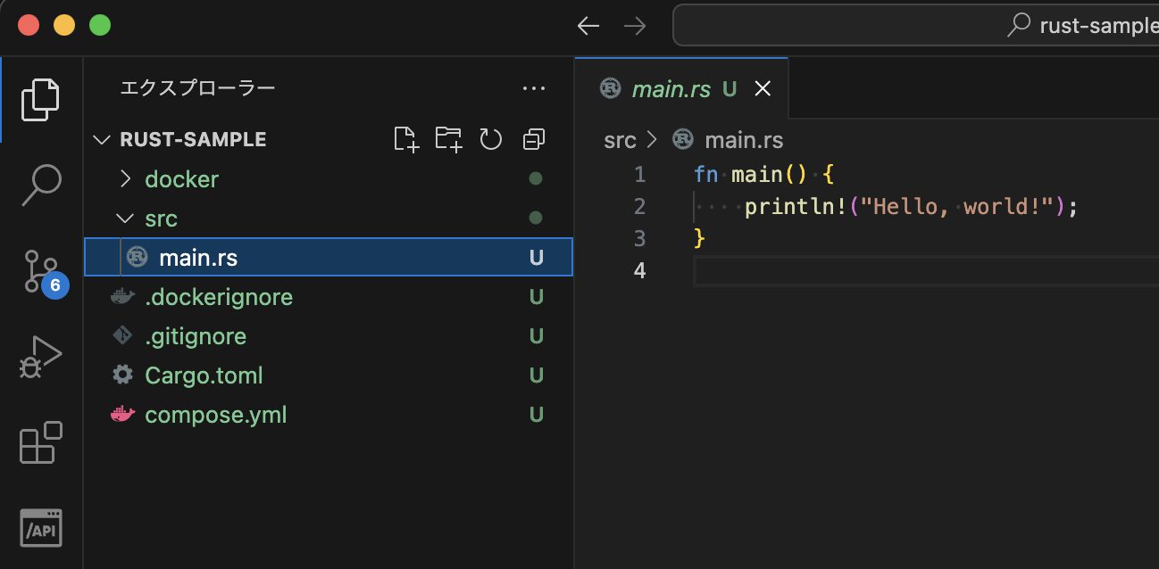 コマンド実行後、下図のように「src/main.rs」、「.gitignore」、「Cargo.toml」が作成されればOKです。