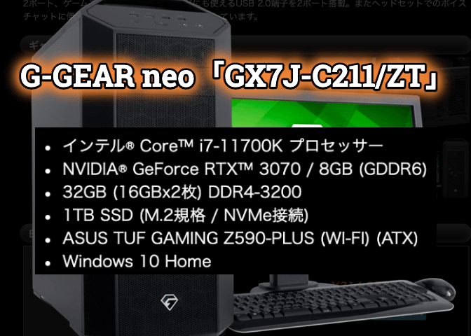 TSUKUMO(ツクモ)のG-GEAR neo「GX7J-C213/ZB」は、ヤマダ電機グループのPC専門店「TSUKUMO」のゲーミングPCです。